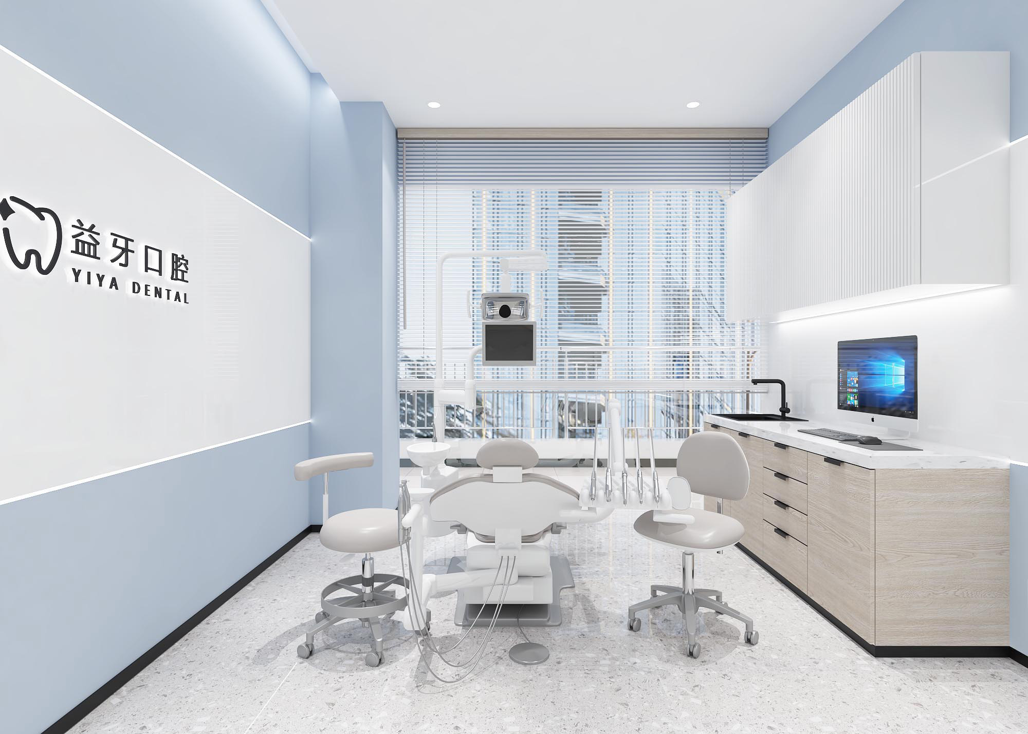 益牙口腔不同明暗的蓝白调、空间与空间的逻辑延续,整个空间的层次感瞬间变得不同,多种融合的色调映射出一个简约高级的设计。